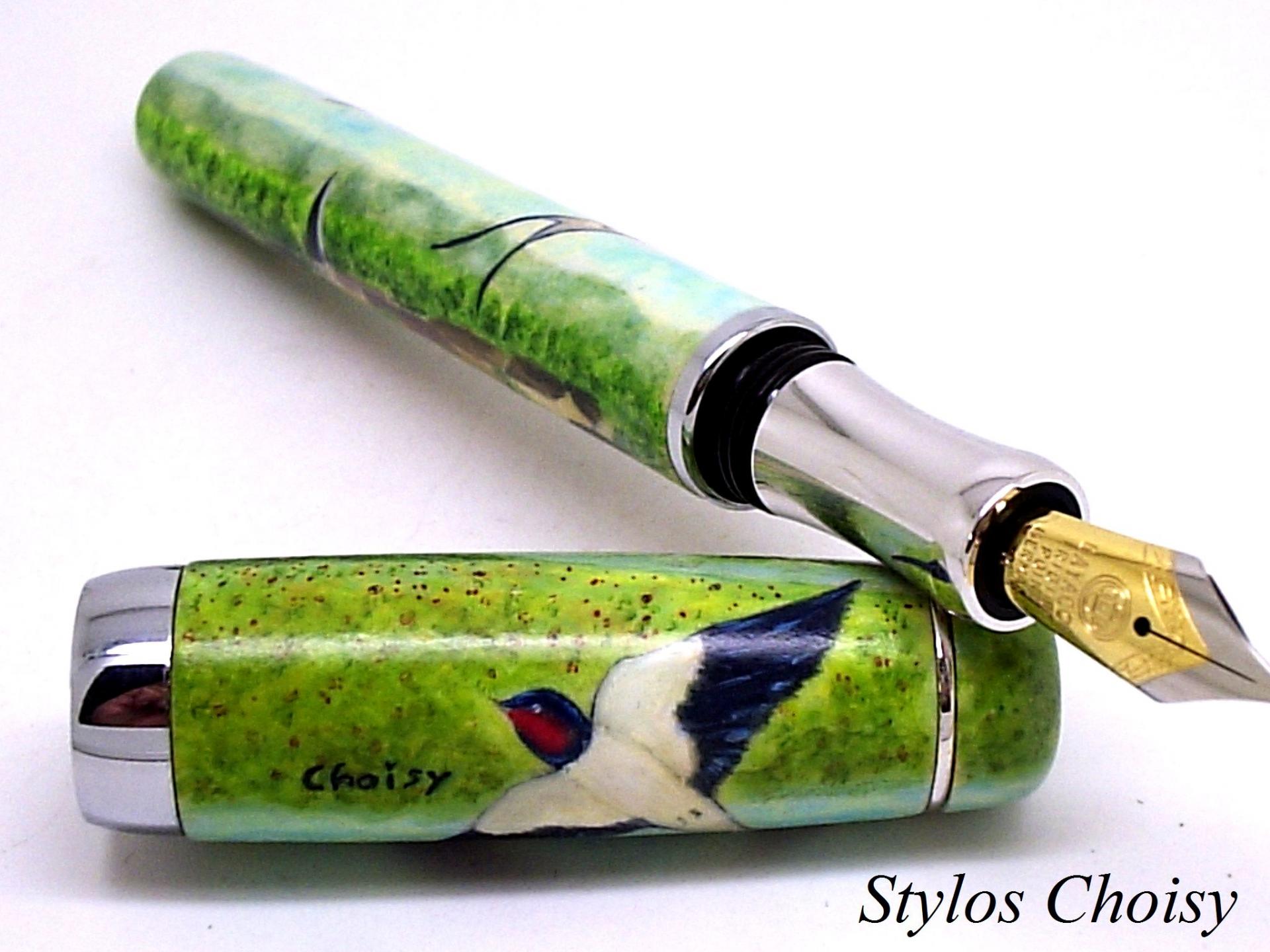 Plume "Le Messager" créé sur commande, miniature d'hirondelles et le village de Loches sur Ource, Aube en Champagne